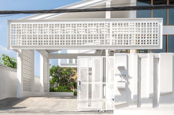 Cánh cửa cổng màu trắng mang lại sự hài hòa cho không gian