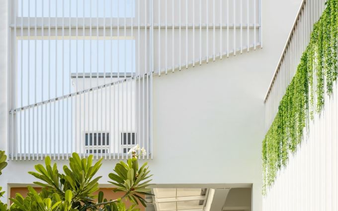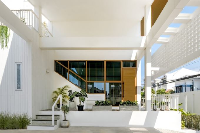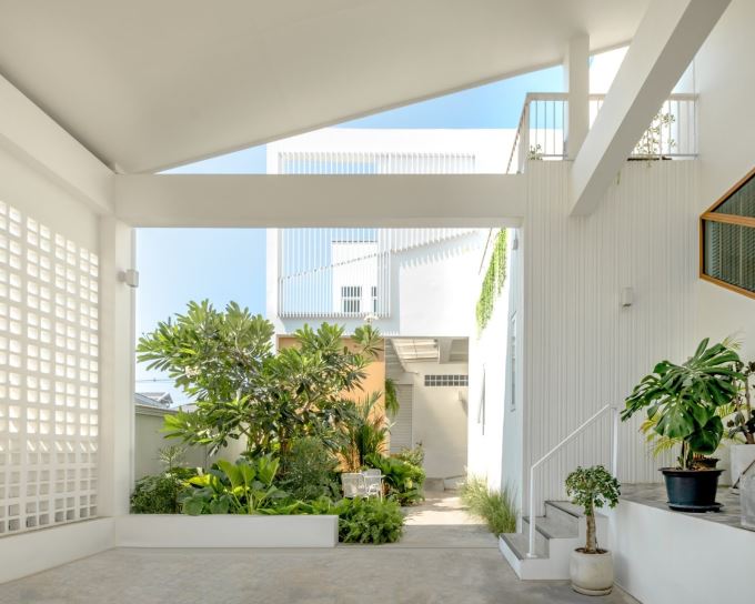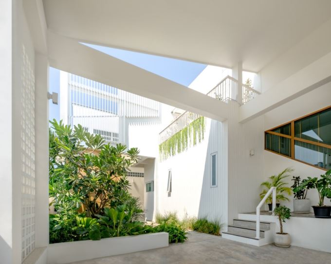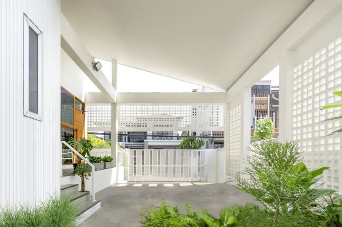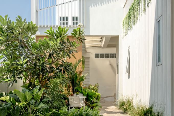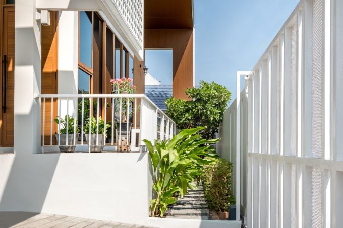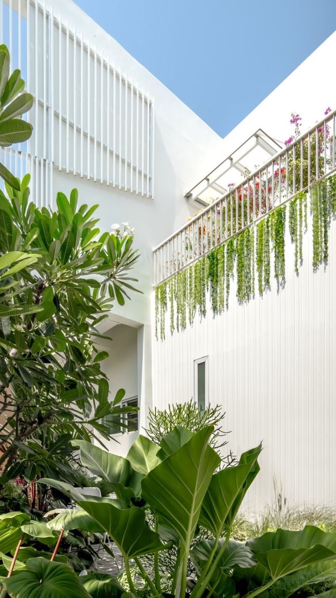 Khoảng ban công với những rặng cây rủ xanh nổi bật trên nền tường trắng, vừa giúp làm mát, vừa tăng tính thẩm mỹ cho Krabuansang House