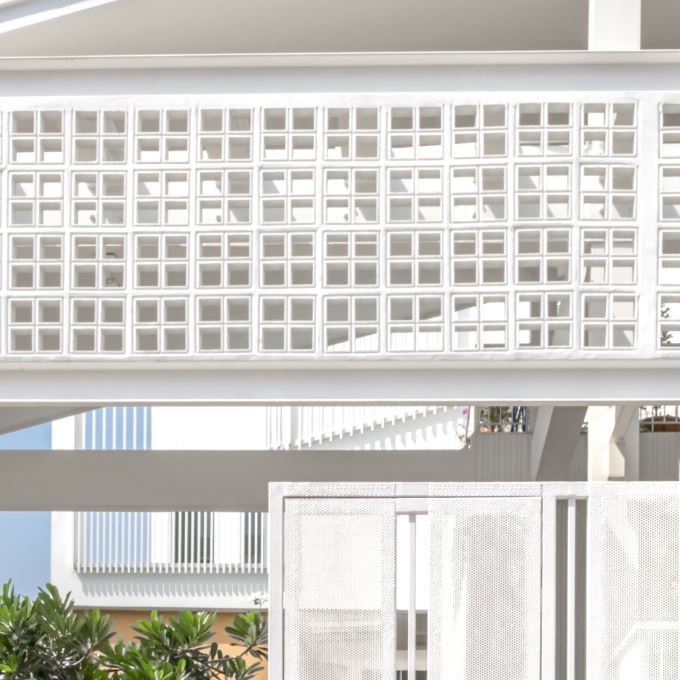 Bức tường gạch bông gió lơ lửng vừa tạo điểm nhấn, vừa giúp che nắng một cách thông minh mà không gây bí bách