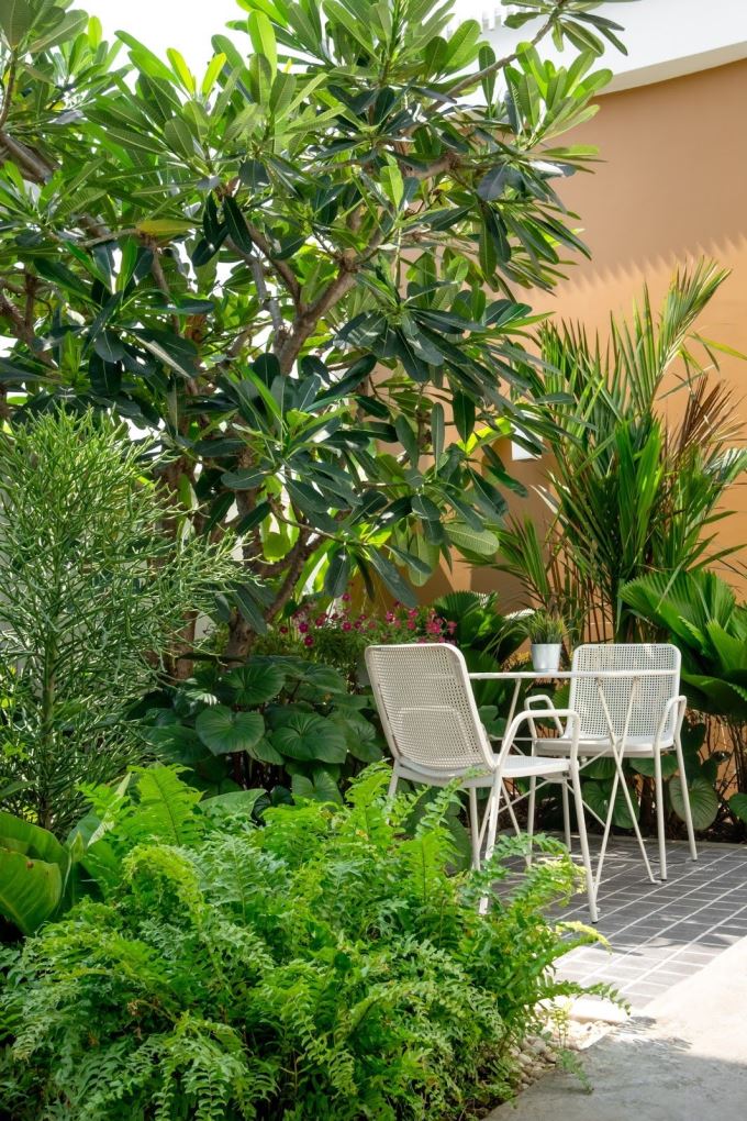 Khoảng sân có bố trí bộ bàn ghế nhỏ để nghỉ ngơi, thư giãn