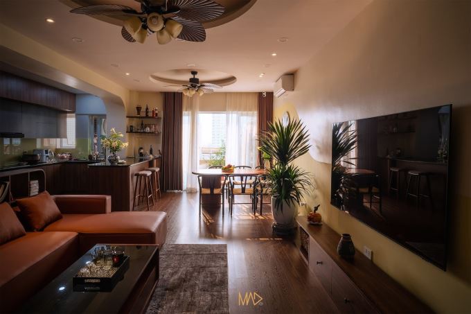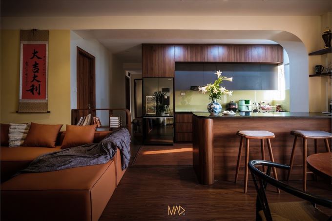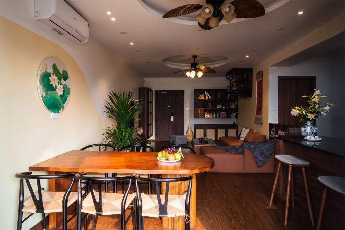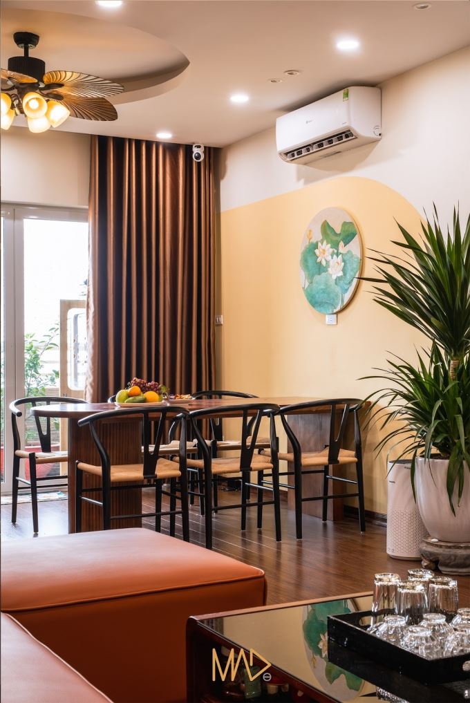 Tông màu vàng – vốn là yêu cầu khá cụ thể từ người bố – đã được tiết chế và cân bằng bằng các mảng tường nhạt, ánh sáng tự nhiên và màu gỗ trầm ấm. Không gian phòng khách, bếp và bàn ăn được liên kết mở, tận dụng tối đa sự thoáng đãng để tránh cảm giác bí bách. Việc sử dụng quạt trần kiểu Đông Dương, tranh tròn treo tường, ghế mây và các chi tiết bo cong giúp không gian giữ được sự mềm mại và gần gũi. Những vật dụng mang tính truyền thống cũng được chọn lựa cẩn thận để hòa quyện với đường nét hiện đại và tinh giản.