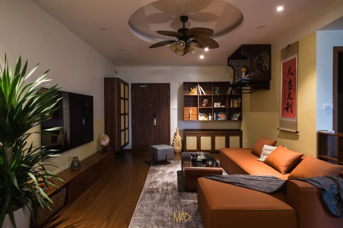 Góc phòng khách ấm cúng với tông nâu trầm, điểm nhấn là tranh thư pháp và tủ sách gia đình