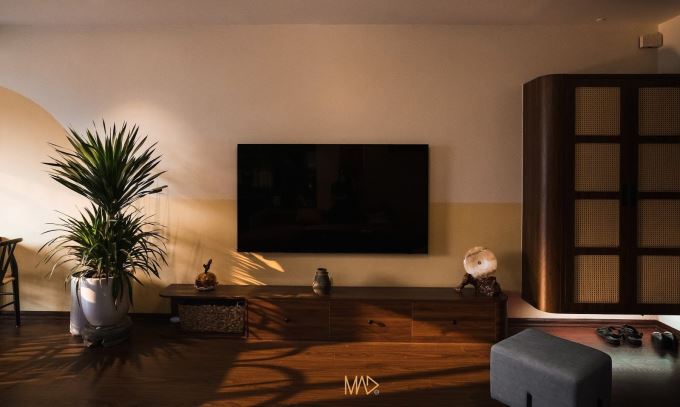 Mảng tường treo TV đơn giản, kết hợp cây xanh và ánh sáng tự nhiên tạo cảm giác thư thái