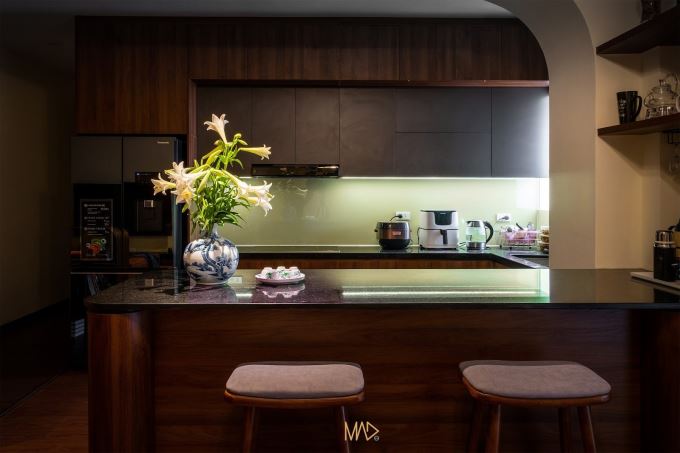 Khu bếp là nơi nhận được nhiều kỳ vọng từ người mẹ – người luôn chuẩn bị bữa ăn cho cả nhà. Không gian được thiết kế thuận tiện với mặt bếp gọn gàng, dễ lau chùi, có thêm khu vực bar nhỏ để mọi người có thể trò chuyện, dùng bữa sáng hay uống trà.