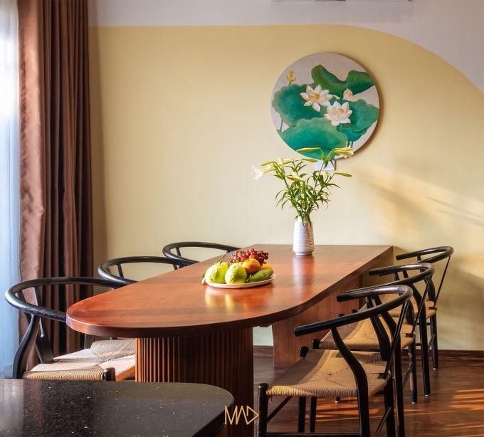 Bàn ăn bo tròn, phối cùng ghế lưng cong, tranh sen nổi bật trên nền tường cong màu vàng