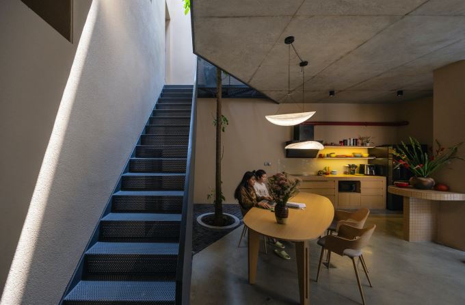 Góc nhìn từ bếp lên cầu thang thép đục lỗ, nơi ánh sáng, gió và nhịp sống hằng ngày đan xen trong từng chuyển động