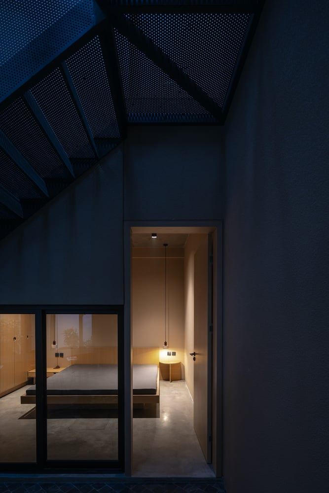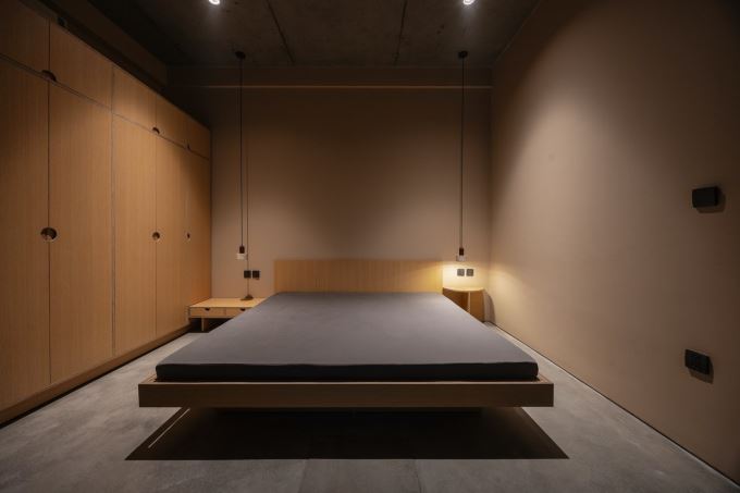 Không gian phòng ngủ yên tĩnh với ánh đèn nhỏ treo thả, sàn bê tông mát lạnh chạm khẽ đôi chân trần, từng món đồ dùng gọn ghẽ và giản dị - tất cả đều cùng nhau dệt nên một nhịp sống chậm rãi, sâu lắng, mà vẫn tràn đầy sức sống.