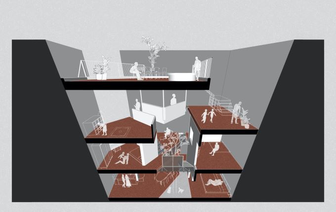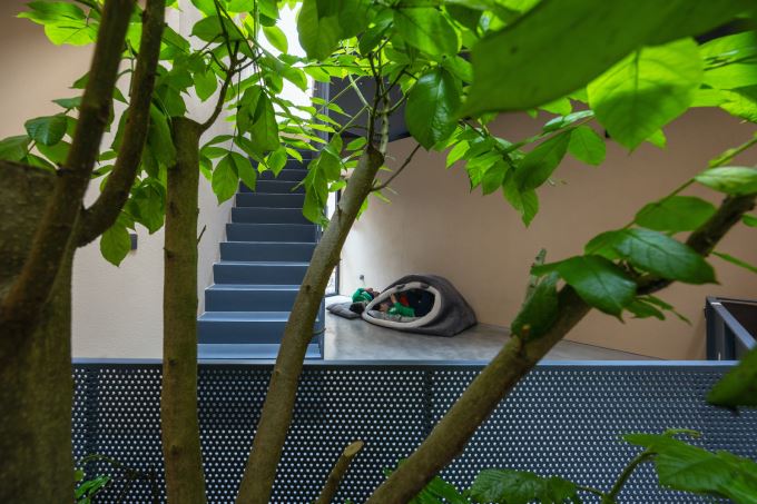 Không gian nội thất được tổ chức xoay quanh giếng trời lớn, với các tầng được kết nối bằng hệ cầu thang thép đục lỗ nhẹ nhàng. Cây xanh được trồng xen kẽ các tầng, như những nhịp thở tươi mới giữa lớp vỏ bê tông thô mộc. Ánh sáng và gió trời di chuyển tự do, tạo thành dòng chảy xuyên suốt khắp ba tầng nhà.
