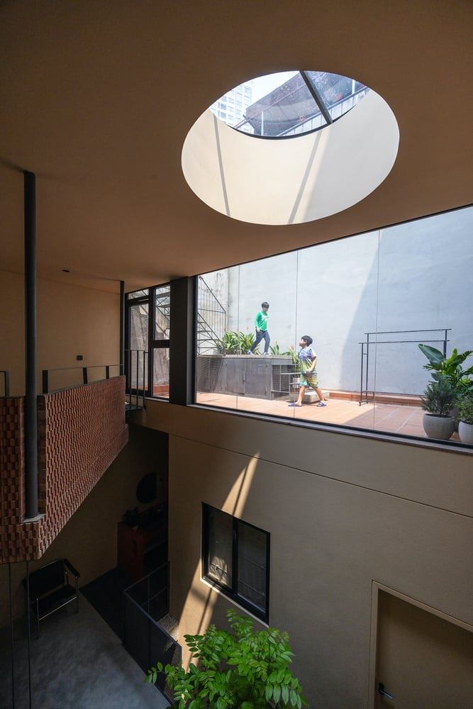 Giếng trời hình elip độc đáo đưa ánh sáng ngập tràn xuống khu vực trung tâm của nhà 3 tầng