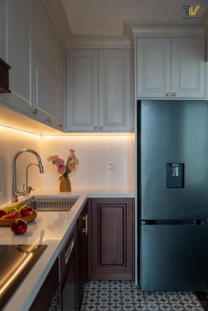 Giải pháp về công năng cho căn bếp đã được đội ngũ Thanh Viet Interior thi công theo đúng với thiết kế 3D. Hệ vách ốp pano kết hợp khuôn để khắc phục điểm yếu mặt bằng, hở khung tủ lạnh và che cấp trần thấp của bếp.