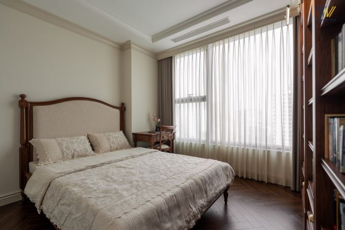 Đặt chân vào không gian, cảm giác đầu tiên căn phòng mang lại chính là sự đơn giản và ấm áp, theo đúng với mong muốn của anh khách trẻ. Phong cách Traditional vẫn là yếu tố chủ đạo: sự đối xứng của hệ phào chỉ, cân đối trong sắp đặt đồ nội thất hay sắc màu trung tính. Thiết kế đơn giản nhưng vật liệu mới là thứ nói lên sự đầu tư và chỉn chu của khách hàng dành cho không gian này. Gỗ sồi Mỹ, vải nỉ Bỉ được lựa chọn cốt để mang lại trải nghiệm nghỉ ngơi thoải mái cho gia chủ.