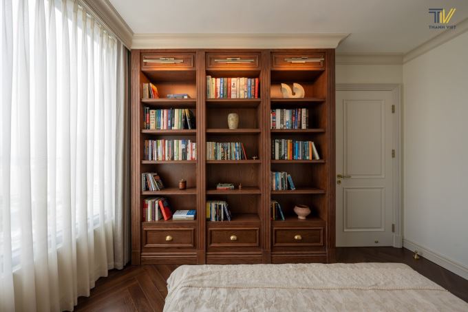 Điểm nhấn cho phòng ngủ này là hệ tủ sách lớn với màu gỗ sồi. Anh khách đặc biệt thích đọc và sưu tầm sách nên đây là thiết kế phù hợp với mong muốn của anh. Ngoài ra, giường ngủ và bàn làm việc cũng được thiết kế cách điệu hơn, tạo điểm nhấn thu hút cho không gian này.