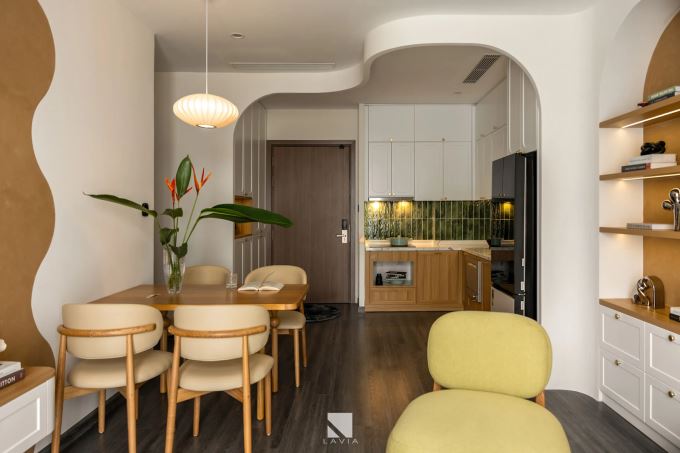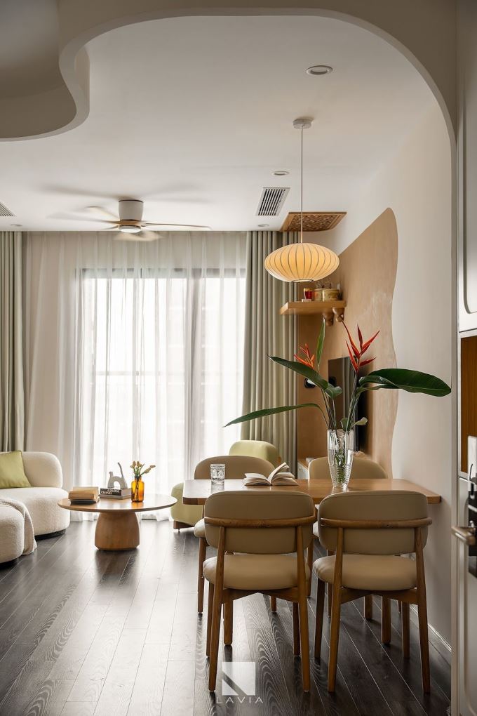 Sàn gỗ được lát liền mạch xuyên suốt tạo cảm giác êm ái và liền lạc. Khu vực bàn ăn - kiêm bàn làm việc - được đặt ở trung tâm, kết nối bếp và phòng khách một cách nhẹ nhàng.