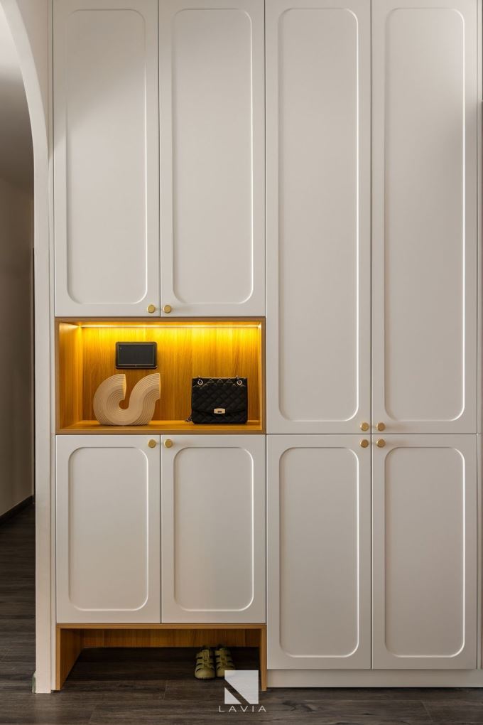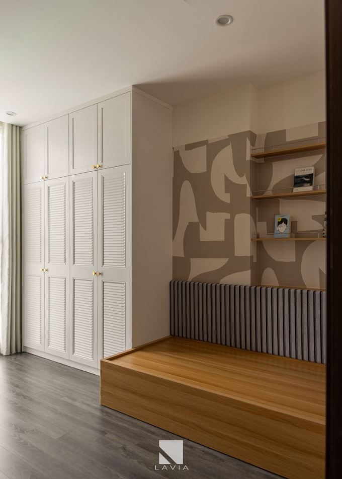 Tủ cao, kệ âm tường và các hộc lưu trữ được bố trí hợp lý để giải phóng mặt sàn, giúp căn hộ rộng hơn mà không rối mắt.