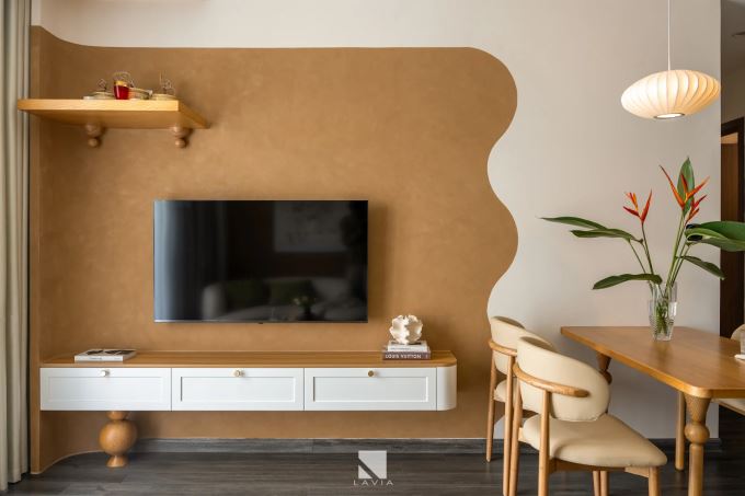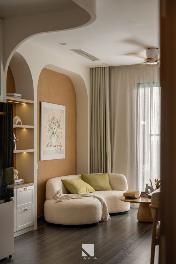 Từng đường cong uyển chuyển trên tường, các vòm bo mềm mại ở kệ tivi, kệ trang trí hay gương soi không chỉ giúp “làm mềm” không gian mà còn tạo cảm giác gần gũi và thư giãn. Sự đồng bộ trong chất liệu - từ gỗ sồi sáng, vải boucle, đá marble vân nhẹ đến ánh sáng vàng ấm áp - đã góp phần tạo nên tổng thể sạch sẽ và yên mắt.