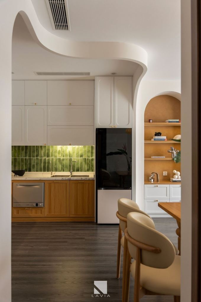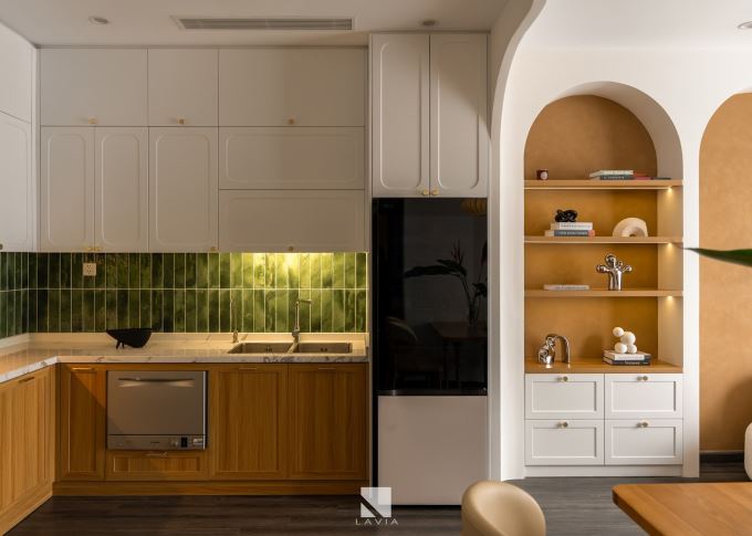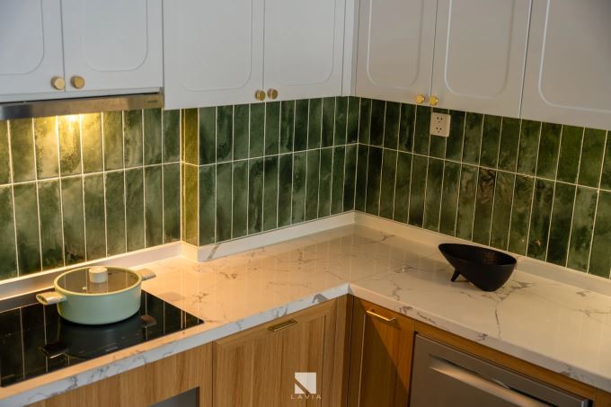 Diện tích không lớn nhưng căn bếp vẫn đủ đầy với bố cục hình chữ L thông minh, sử dụng gạch ốp xanh rêu lạ mắt làm điểm nhấn. Tủ bếp trên dưới phối trắng - vân gỗ kết hợp mặt đá marble nhân tạo vân mây nhẹ tạo cảm giác sáng, sạch và ấm áp.