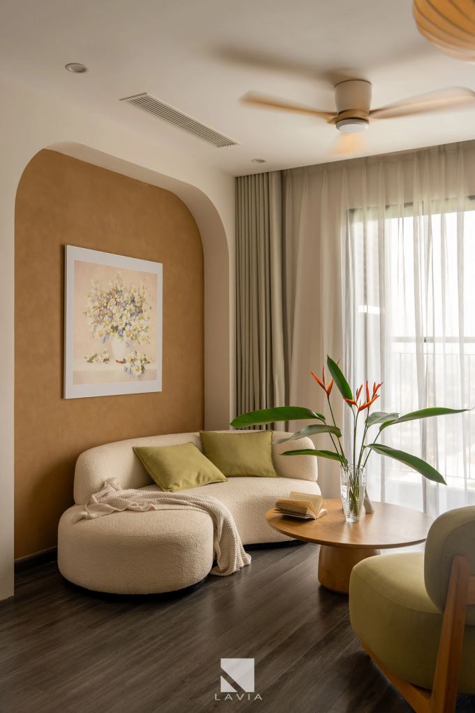 Phòng khách được bố trí gọn gàng với sofa boucle bo tròn kết hợp bàn trà tròn gỗ tự nhiên. Bộ ghế olive không quá nổi bật nhưng rất “ăn rơ” với tone tường ấm và tranh hoa cúc treo phía sau. Ánh sáng từ ban công xuyên qua lớp rèm voan mỏng khiến toàn bộ không gian như phủ một lớp sương nhẹ, tĩnh lặng.
