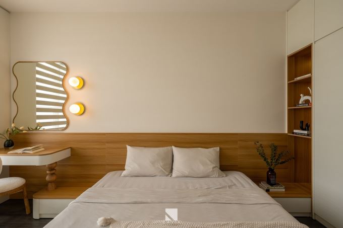 Không quá rộng nhưng phòng ngủ vẫn tạo được cảm giác thư giãn nhờ cách phối màu sáng, bố cục mở và nội thất tối giản. Giường đặt giữa không gian, đầu giường ốp gỗ ấm kết hợp bàn trang điểm nhỏ gọn với chân tiện tròn độc đáo.