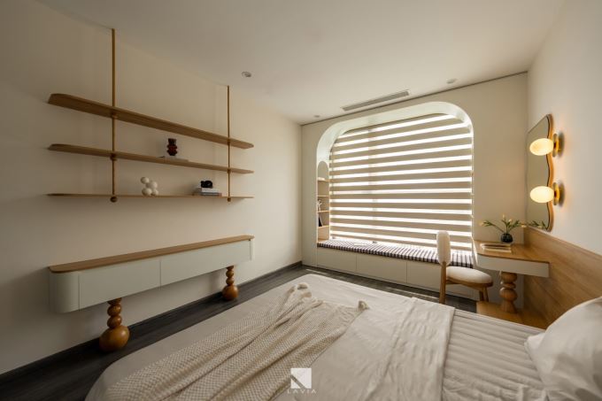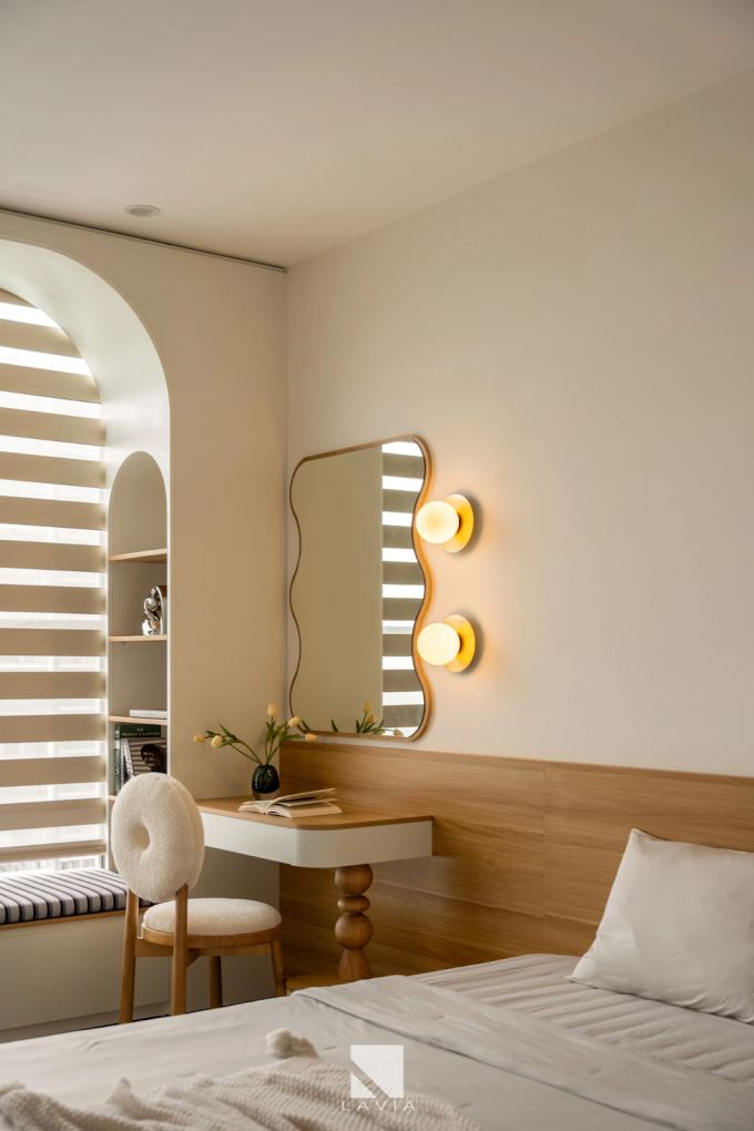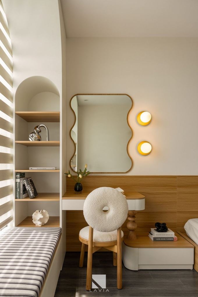Chi tiết gương bo tròn, đèn ngủ ốp tường ánh vàng hay các kệ trang trí âm tường đều giúp căn phòng tuy đơn giản nhưng vẫn đầy đủ tiện nghi và cảm xúc.