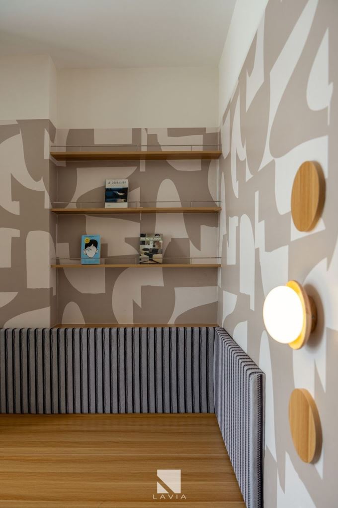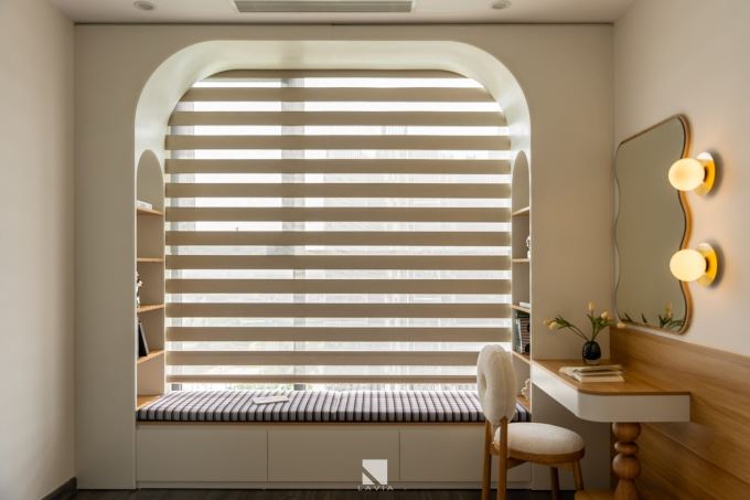 Góc ngồi bên cửa sổ là điểm nhấn đặc biệt - một băng ghế dài tích hợp ngăn kéo, đi kèm đệm sọc kem - đen, vừa đủ để nằm dài đọc sách, thư giãn hay chỉ đơn giản là ngắm mây bay.