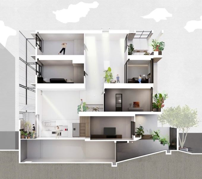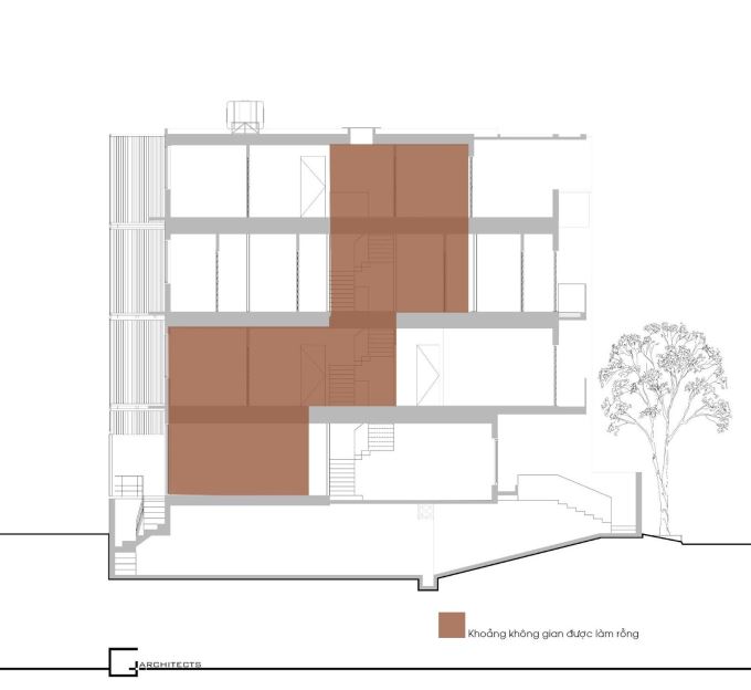 Để khắc phục hạn chế của công trình, đội ngũ kiến trúc sư đã đưa ra giải pháp cải tạo nhà cũ thông minh, bảo tồn bộ khung nhà như một phần ký ức, giữ nguyên phần chịu lực và làm rỗng không gian bên trong. Những khoảng thông tầng và khoảng trống được kiến trúc sư thêm vào tựa như những nhịp thở. Ánh sáng không chỉ đơn thuần là yếu tố chiếu sáng mà còn là chất liệu để tạo nên cảm xúc cho không gian.