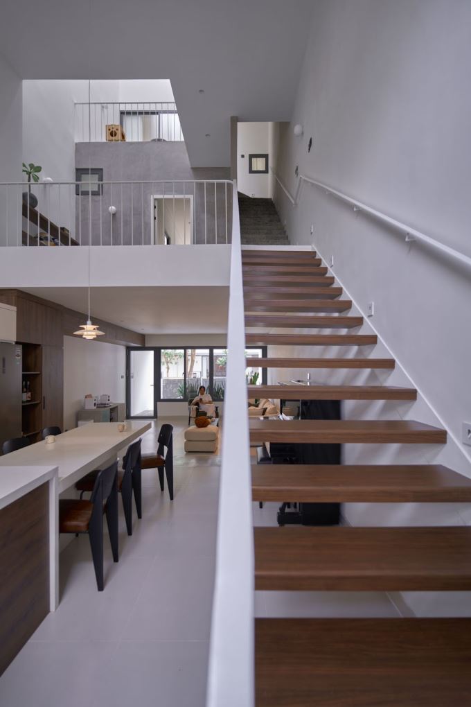 Thông gió tự nhiên là yếu tố rất quan trọng trong những công trình được xây dựng tại nơi có khí hậu nóng ẩm như thành phố Hồ Chí Minh. Chính vì thế, cầu thang bộ đã được chuyển đổi từ giữa nhà ra sát vách nhà giúp mở rộng tầm nhìn theo chiều thẳng đứng. Khi bước vào ngôi nhà ai cũng có thể cảm nhận thấy ánh sáng và gió len lỏi qua từng bậc thang, chạm vào không gian nội thất một cách vô cùng sống động.