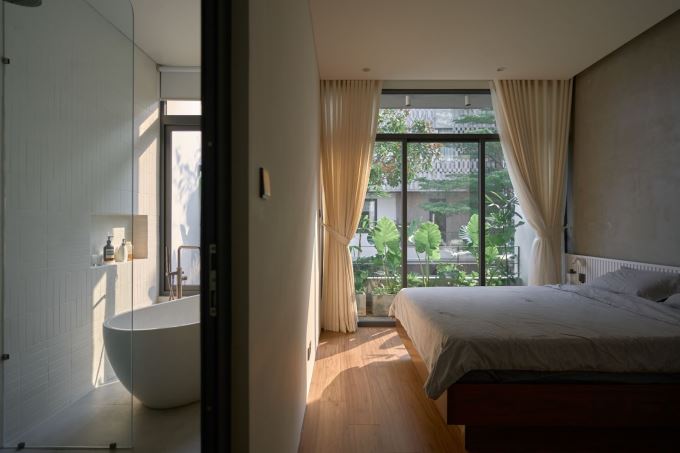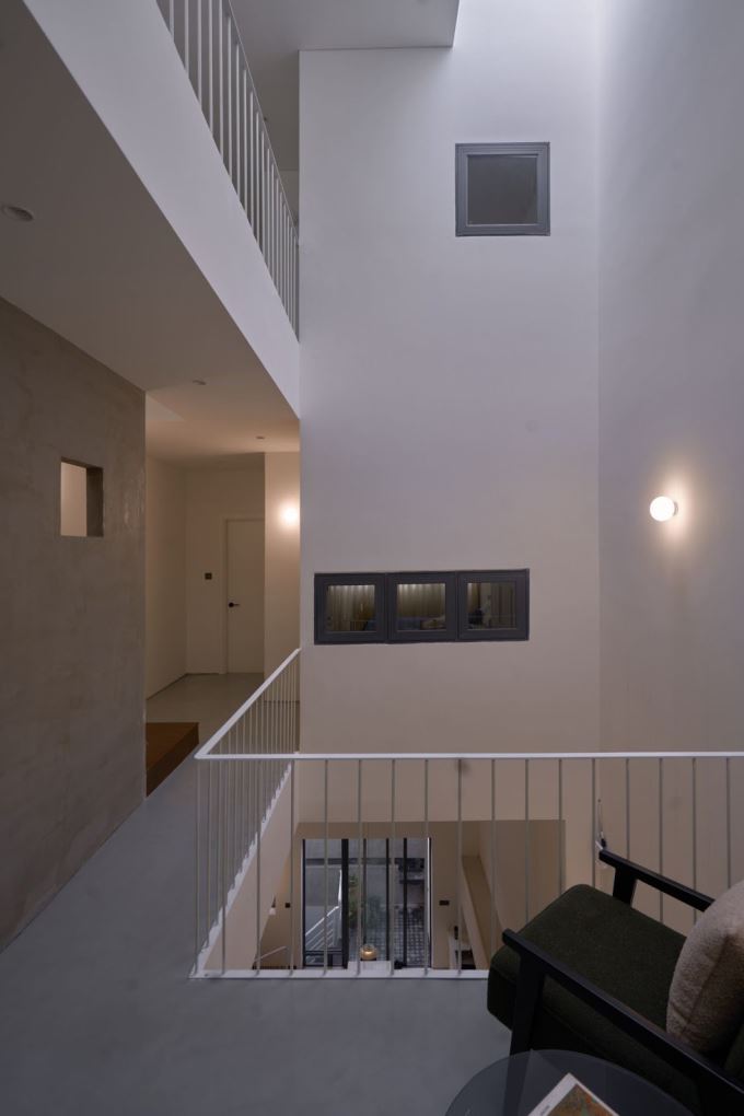 Ngoài ra, các không gian chức năng cũng không còn bị ngăn cách bởi các bức tường nặng nề. Phòng khách, phòng ngủ và bếp đều được kết nối với nhau bằng những điểm “tạm nghỉ” như giếng trời, hành lang, sàn lệch tầng. Những “điểm nghỉ” này không chỉ giúp cân bằng tỷ lệ kiến trúc mà còn mang lại chiều sâu cảm xúc.