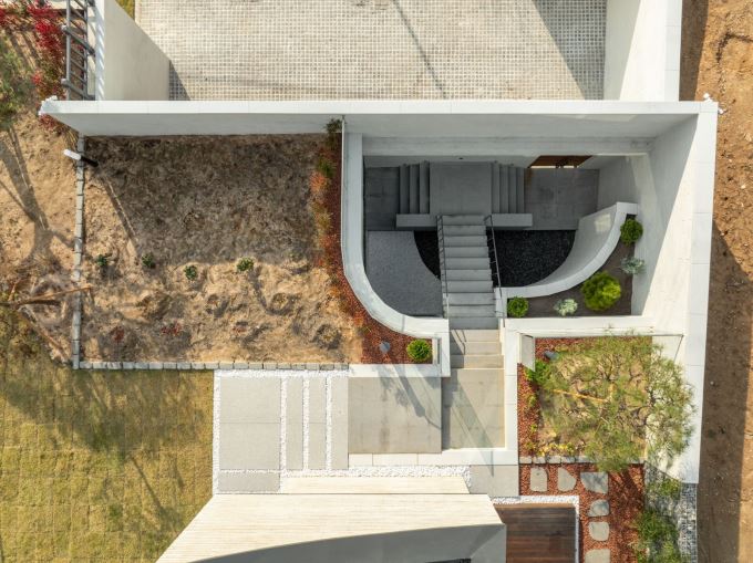 Khoảng sân trũng nhìn từ dưới lên được tường bê tông uốn cong che chắn, tạo khung cảnh yên tĩnh