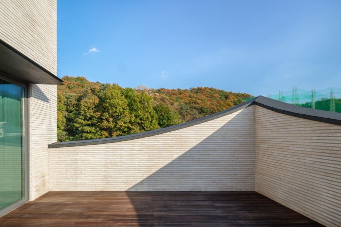 Ban công tầng 2 uốn cong với lan can kín đáo, mở tầm nhìn ra cảnh quan đồi núi