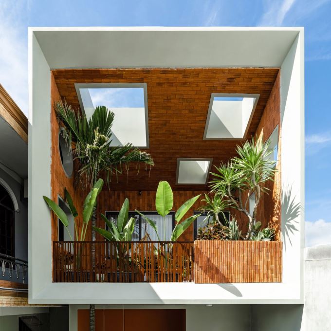 Mặt tiền ngôi nhà nổi bật với khối ban công xanh mát được thiết kế như một khu vườn treo, ẩn mình sau hệ lam gỗ dọc
