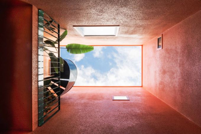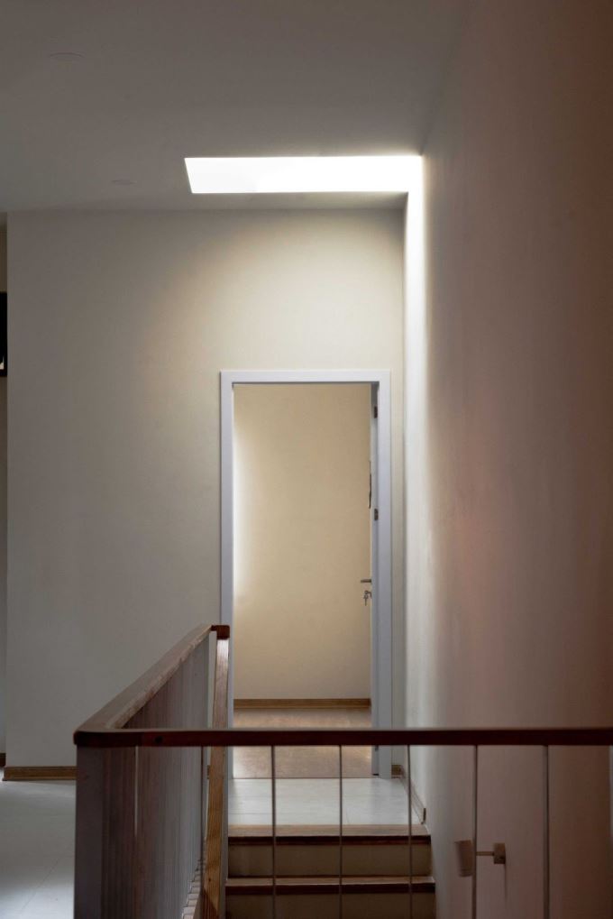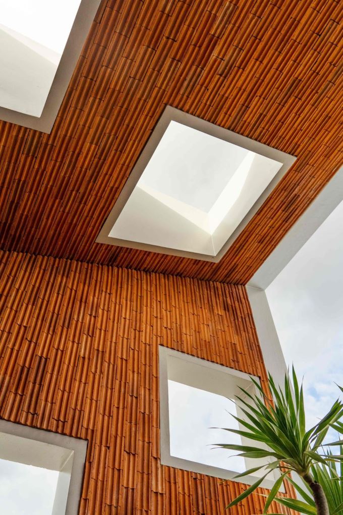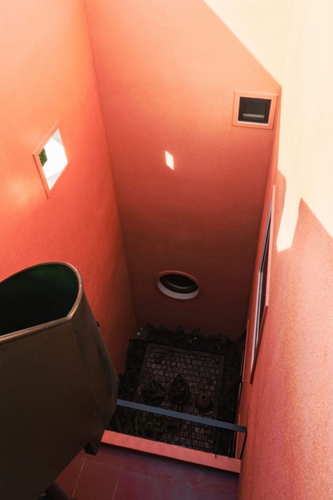 Phần trần logia được thiết kế nghiêng để tạo chiều sâu và hướng nhìn lên trời, tuy nhiên độ nghiêng này cũng có thể khiến nước mưa tràn vào. Để xử lý, các viên gạch được xếp ngang và vuông góc với hướng nước chảy, giúp hạn chế việc nước len vào phía trong. Giải pháp kỹ thuật đơn giản nhưng hiệu quả, cho thấy sự kết hợp giữa thẩm mỹ và công năng được tính toán kỹ lưỡng.