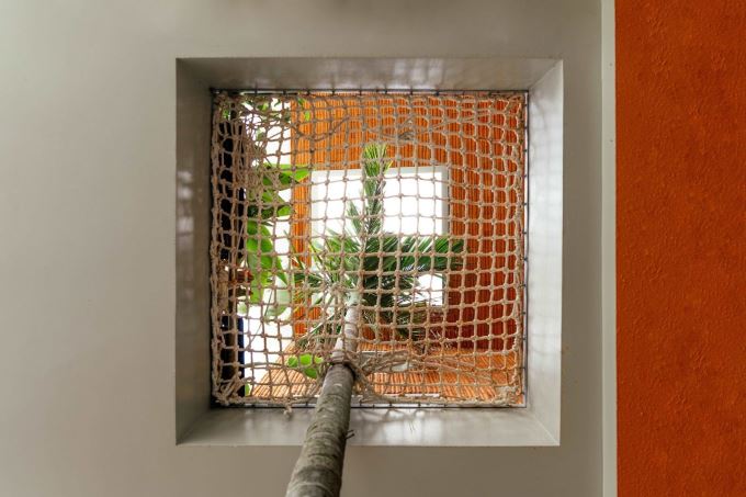 Một chi tiết đáng chú ý là sự hiện diện của cây cau – hình ảnh quen thuộc trong văn hóa nhà vườn Việt. Ngay dưới cây cau, một tấm lưới lớn được bố trí để trẻ em có thể leo trèo, đọc sách, hay đơn giản là nằm thư giãn. Đây không chỉ là một yếu tố thẩm mỹ hay kỹ thuật, mà còn là sự gợi nhớ đến hình ảnh “trước cau sau chuối” quen thuộc, đưa yếu tố ký ức vào trong không gian sống hiện đại.
