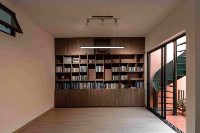 Điểm đặc biệt của công trình là cách thiết kế mặt tiền và vật liệu mang tính liên kết giữa hai khối nhà. Nhóm thiết kế sử dụng bảng màu và tỷ lệ cửa sổ tương đồng với căn nhà cũ của ba mẹ, đồng thời kết hợp hệ lam và cửa sắt sơn tĩnh điện màu đen chạy dài ngang mặt tiền để tạo nên một “mặt đứng liên tục”, giúp tổng thể công trình liền mạch về thị giác. Tuy được xây dựng ở hai thời điểm khác nhau, hai căn nhà vẫn kết nối chặt chẽ nhờ ngôn ngữ kiến trúc hài hòa.