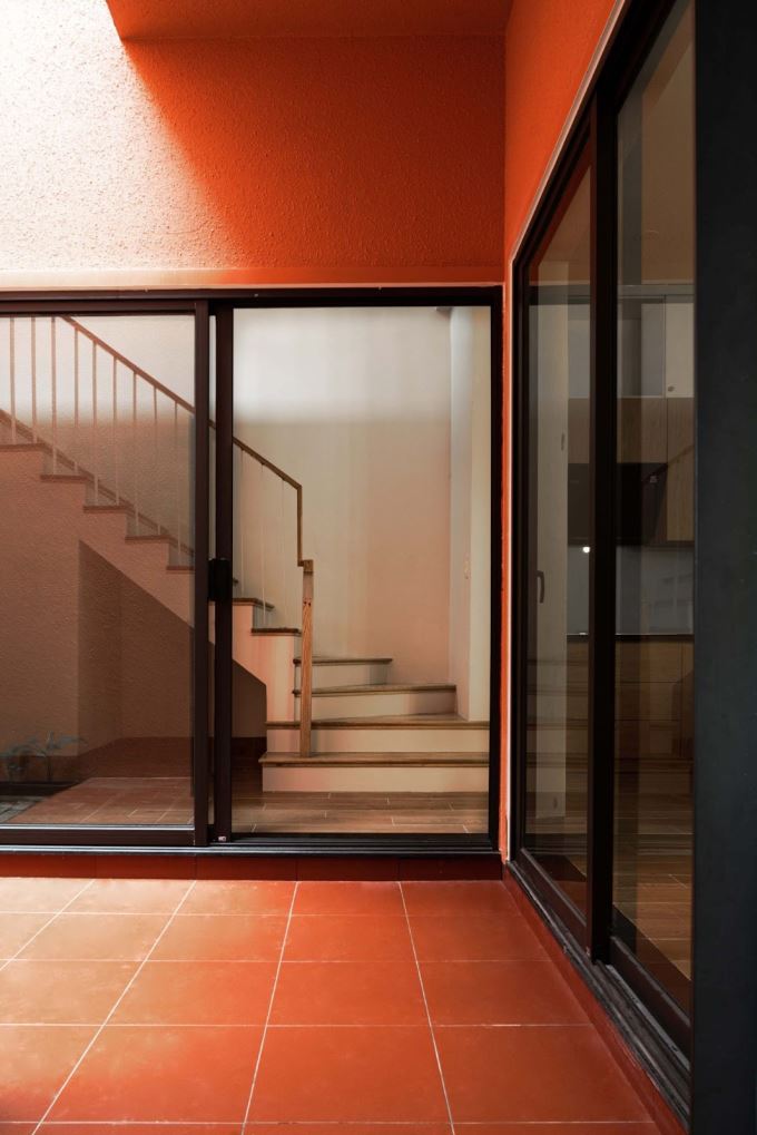 Vật liệu chính của công trình là gạch bốn lỗ màu đỏ cam – loại gạch phổ biến tại địa phương. Tuy nhiên, thay vì sử dụng theo cách thông thường, nhóm thiết kế đã cắt nhỏ và ốp dọc gạch ở khu vực logia và mặt đứng. Tường và trần được ốp đồng chất liệu, tạo nên một “lớp áo” thị giác độc đáo, đồng thời bảo vệ công trình khỏi tác động thời tiết.